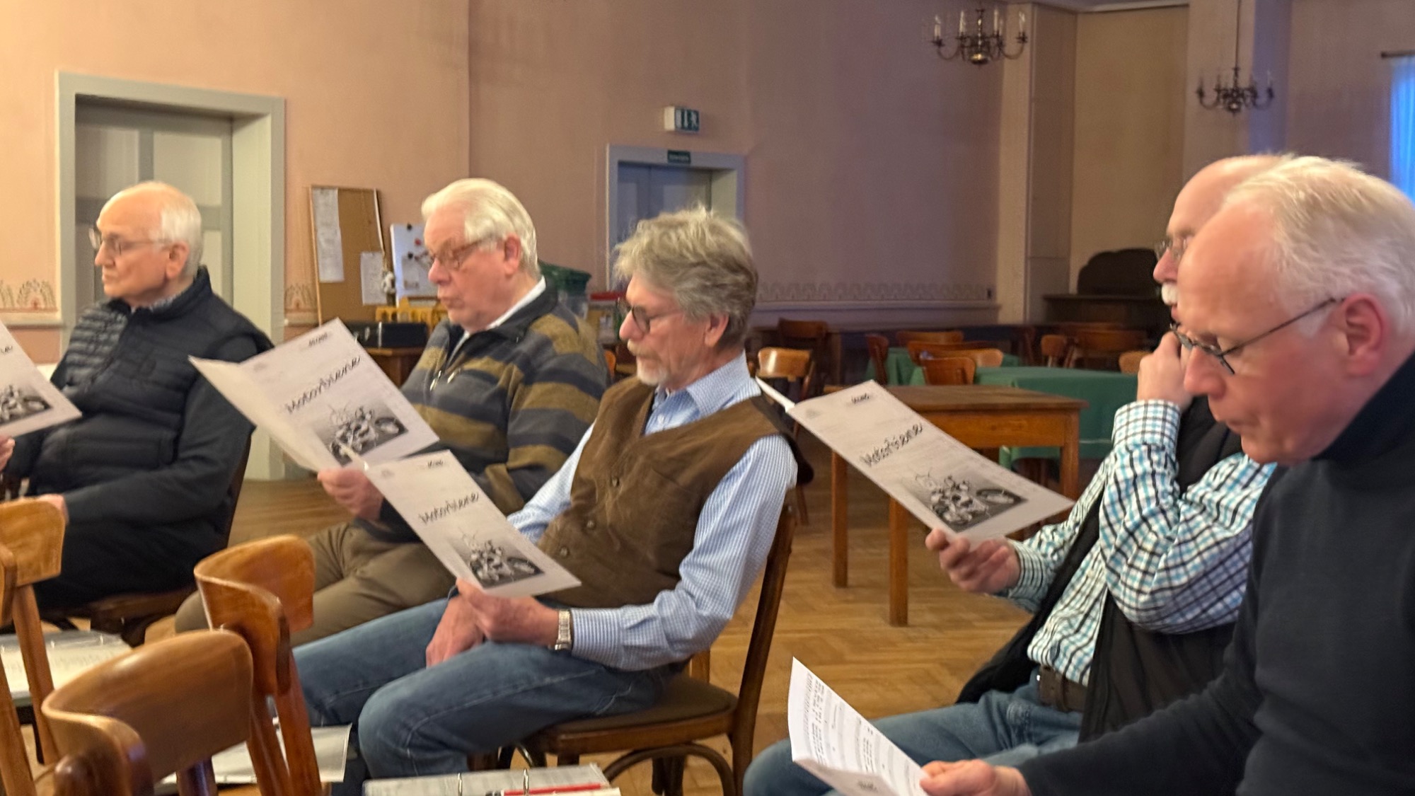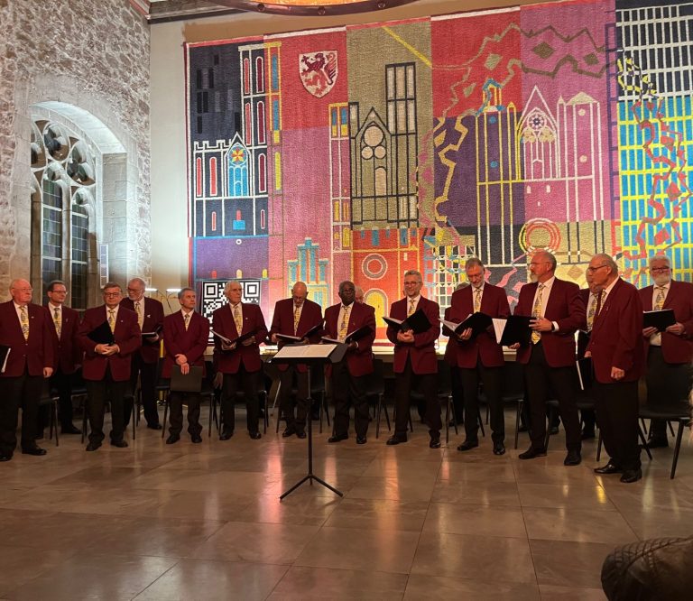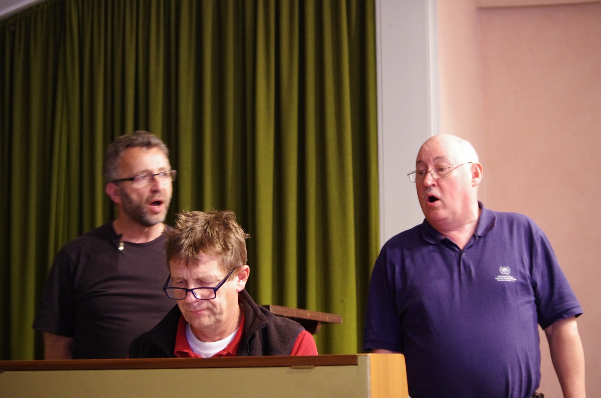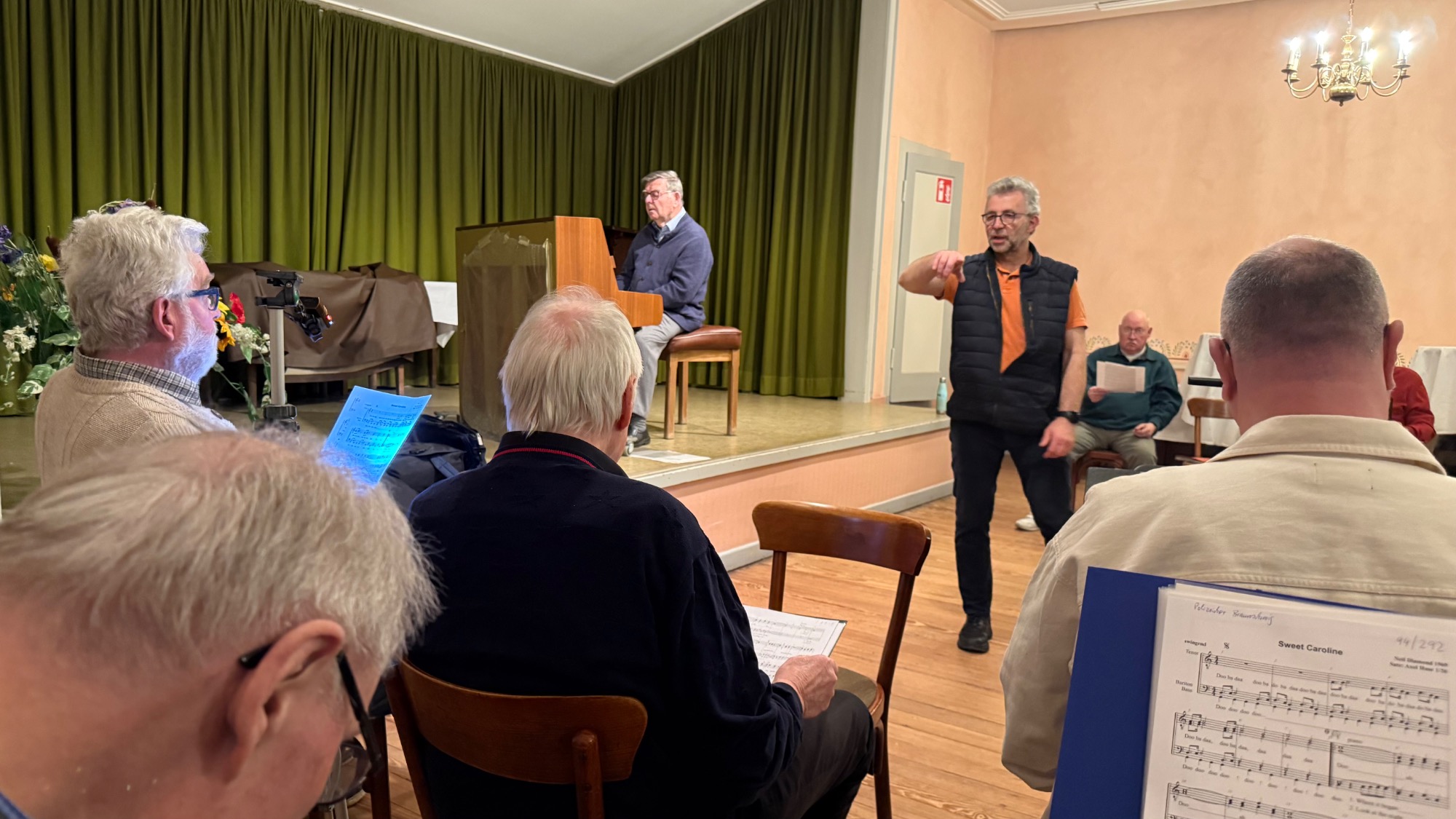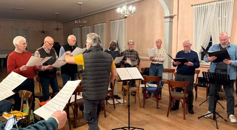 Als Männerchor singen wir meistens vierstimmig, also mit zwei Tenorstimmen sowie Bariton und Bass. Bei einigen Stücken begleitet uns Axel Huse, unser Chorleiter, mit Klavier oder Gitarre, doch oft singen wir a cappella. Klingt vielleicht kompliziert, ist es aber nicht. Viele unserer Songs gehen direkt ins Ohr, die hat jeder schon mal gehört.